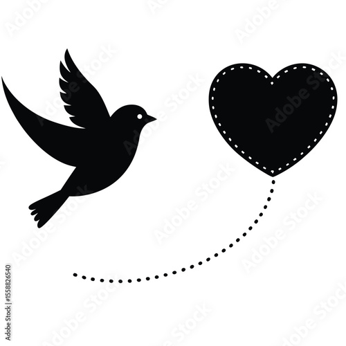 Fototapeta premium Black silhouette of a bird flying towards a heart shape with dotted line