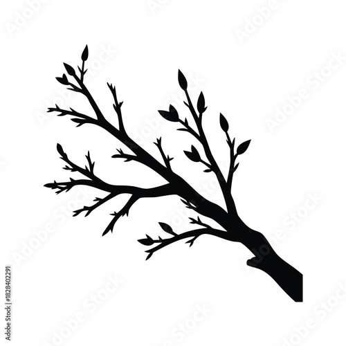 © MdShahriar, Obraz premium Black silhouette of a budding tree branch against a white background, dead willow branch silhouette vector illustration