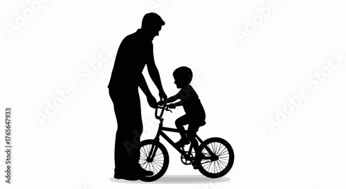 © Alex_Kalin, Fototapeta premium Black silhouette of a dad teaching his child to ride a bike. Fatherhood and family bonding concept. Minimalist vector illustration isolated on white background