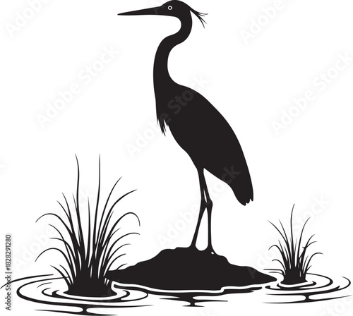© shopone, Fototapeta premium Black silhouette of a heron standing in water with reeds