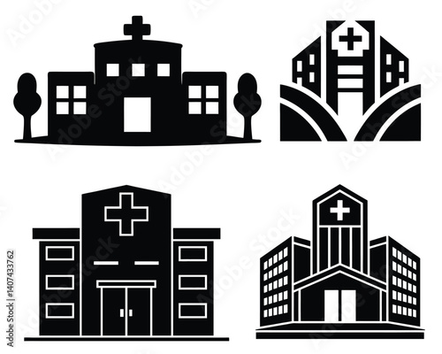 © MSTTARZINA, Obraz premium Black Silhouette of a Hospitals Building with Cross Symbol, Healthcare Vector Illustration