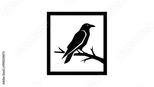 Fototapeta premium Black silhouette of a raven perched on a branch, framed within a solid rectangle