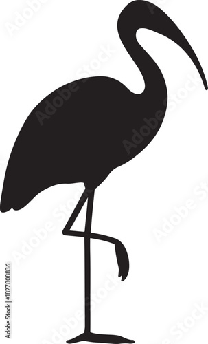 Fototapeta premium Black silhouette of a wading ibis bird standing on one leg isolated on white