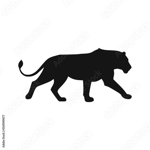 © Lily, Obraz premium Black silhouette of a walking lion, side view, against a white background.