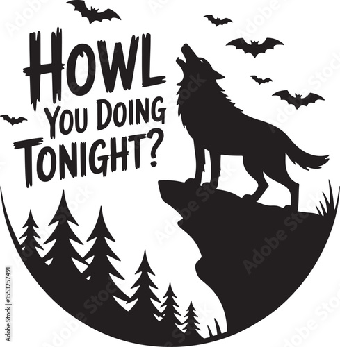 © MDSHOFIQUL, Naklejka premium Black silhouette of a wolf howling on a cliff with bats and trees white