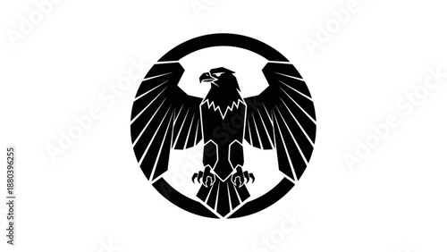 Obraz premium Black silhouette of an eagle with spread wings in a circle on white background.