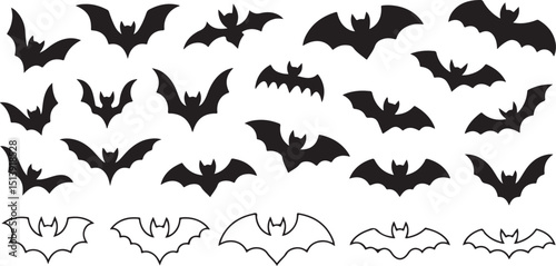 © MdMezbahul, Naklejka premium Black silhouette of bats in various poses perfect for halloween or spooky themed design