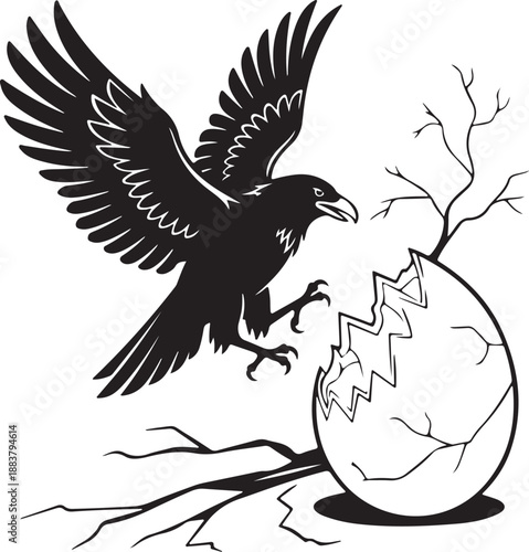 Fototapeta premium Black Silhouette of Flying Raven Attacking Cracked Egg Vector Illustration