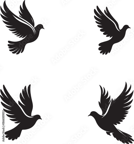 Fototapeta premium Black Silhouette of Four Flying Doves in Circular Arrangement, Vector...