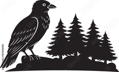 Obraz premium Black Silhouette of Raven on Rock with Pine Trees bird