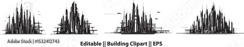 Naklejka premium Black Silhouette of Sci-Fi City – Skyline with Antennas & Skybridges on White...