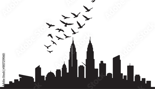 © Mazharul, Fototapeta premium black silhouette of skyline with birds on white background, vector