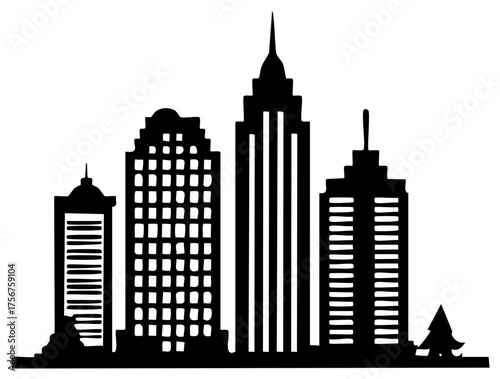 © Андрій О., Naklejka premium Black silhouette of tall skyscrapers and a small evergreen tree against a white background
