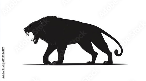© Zabi, Obraz premium Black silhouette of the head and body of an angry saber-toothed lion, vector logo on a white background, simple shapes, flat design style, high contrast, bold lines, sharp edges, bold outline, minimal
