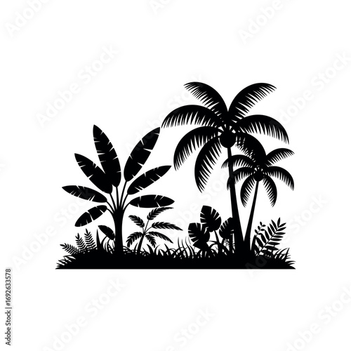 © Arafat, Fototapeta premium Black silhouette of tropical plants and palm trees on white background foliage