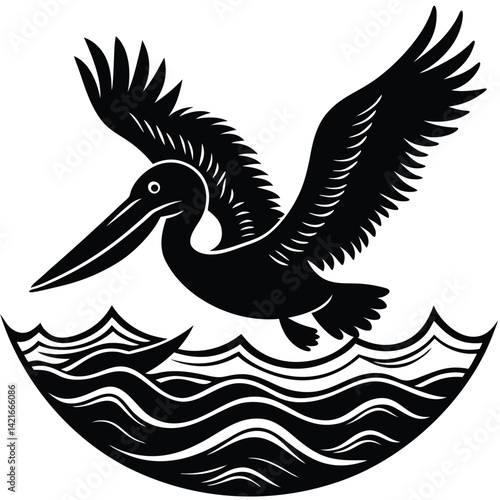Fototapeta premium Black Silhouette Pelican Flying Over Waves Vector Illustration