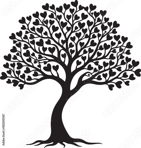 © shopone, Fototapeta premium Black silhouette tree with heart shaped leaves white