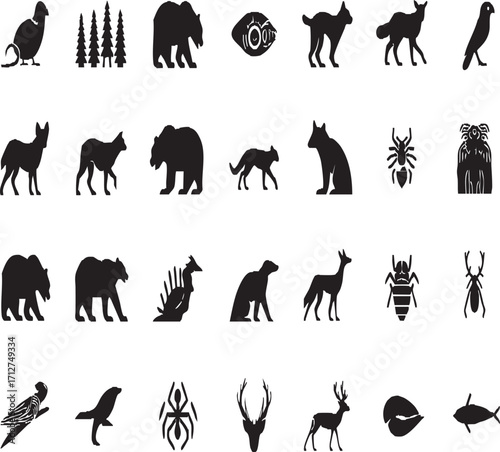 Naklejka premium Black silhouette vector icons of wildlife animals and insects