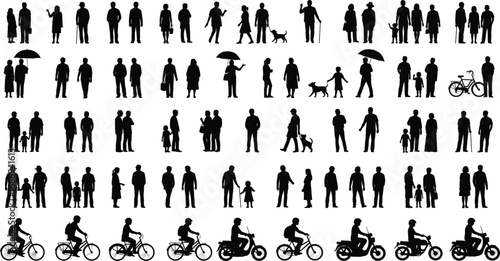© Ideasy Mind, Fototapeta premium Black silhouette vector set of people in various daily activities, walking, cycling, with children and pets, showcasing lifestyle and interaction