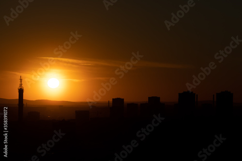 Fototapeta premium Black silhouettes of buildings are on a red sky background with orange and yellow sunset