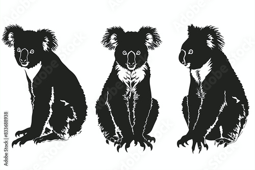 Fototapeta premium Black silhouettes of koala in different poses on a white background. Koala...