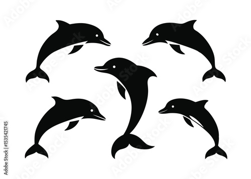Fototapeta premium Black silhouettes of swimming dolphins arranged in a circular composition with a white background