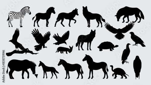 Fototapeta premium Black silhouettes of various animals including zebra, horse, wolf, bird, turtle, and more