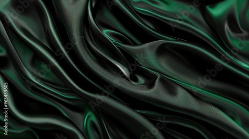 © Lasvu, Fototapeta premium Black silk fabric with green stripes, wrinkled texture. Abstract dark green background template.