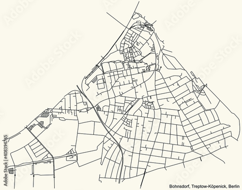 © Momcilo, Naklejka premium Black simple detailed city street roads map plan on vintage beige background of the neighbourhood Bohnsdorf locality of the Treptow-Köpenick of borough of Berlin, Germany