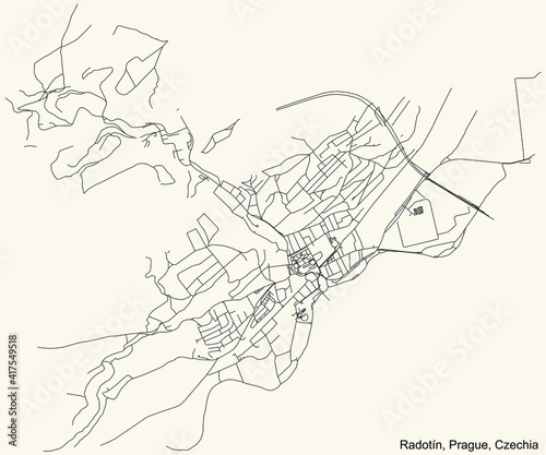 © Momcilo, Fototapeta premium Black simple detailed street roads map on vintage beige background of the municipal district Radotín cadastral area of Prague, Czech Republic