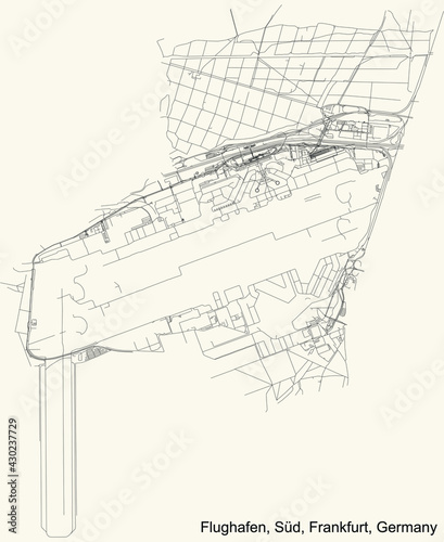 © Momcilo, Fototapeta premium Black simple detailed street roads map on vintage beige background of the neighbourhood Flughafen city district of the Süd urban district (ortsbezirk) of Frankfurt am Main, Germany