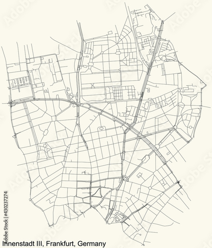 © Momcilo, Fototapeta premium Black simple detailed street roads map on vintage beige background of the neighbourhood Innenstadt III district (ortsbezirk) of Frankfurt am Main, Germany
