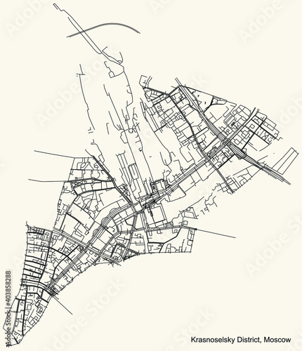© Momcilo, Fototapeta premium Black simple detailed street roads map on vintage beige background of the neighbourhood Krasnoselsky District of the Central Administrative Okrug of Moscow, Russia