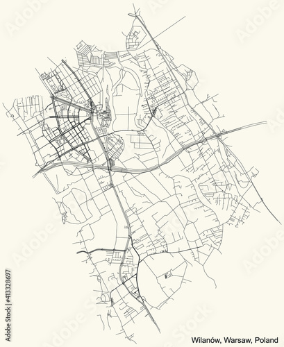 © Momcilo, Fototapeta premium Black simple detailed street roads map on vintage beige background of the neighbourhood Wilanów district of Warsaw, Poland