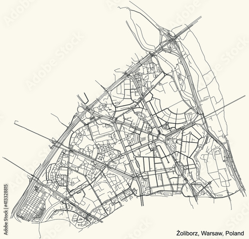 © Momcilo, Fototapeta premium Black simple detailed street roads map on vintage beige background of the neighbourhood Żoliborz district of Warsaw, Poland