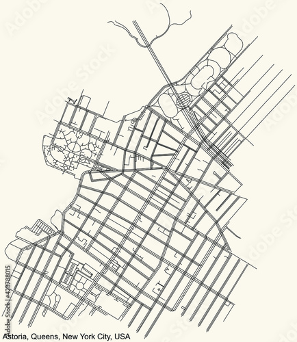© Momcilo, Fototapeta premium Black simple detailed street roads map on vintage beige background of the quarter Astoria neighborhood of the Queens borough of New York City, USA