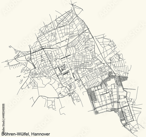 © Momcilo, Fototapeta premium Black simple detailed street roads map on vintage beige background of the quarter Döhren-Wülfel district of Hanover, Germany