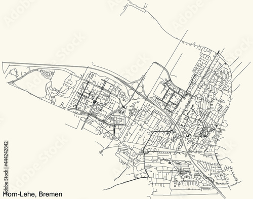 Fototapeta premium Black simple detailed street roads map on vintage beige background of the quarter Horn-Lehe subdistrict of Bremen, Germany