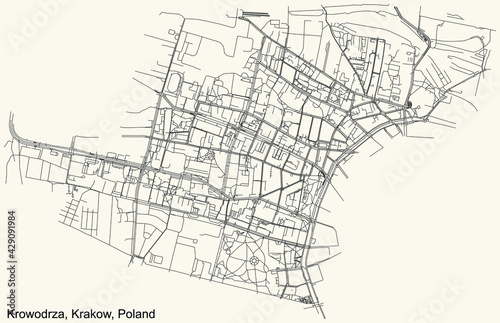 Fototapeta premium Black simple detailed street roads map on vintage beige background of the quarter Krowodrza district of Krakow, Poland