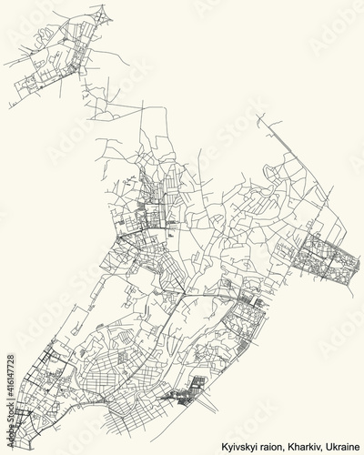 © Momcilo, Fototapeta premium Black simple detailed street roads map on vintage beige background of the quarter Kyivskyi district (raion) of Kharkiv, Ukraine