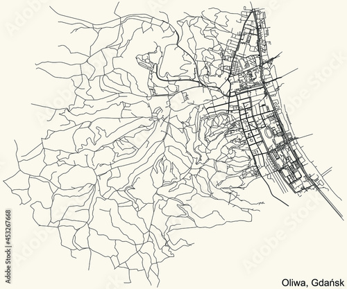Naklejka premium Black simple detailed street roads map on vintage beige background of the quarter Oliwa district of Gdansk, Poland
