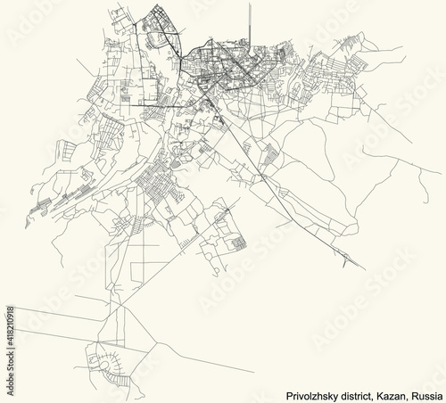 © Momcilo, Fototapeta premium Black simple detailed street roads map on vintage beige background of the quarter Privolzhsky district (raion) of Kazan, Russia