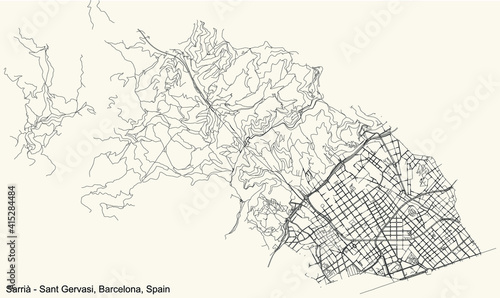 Fototapeta premium Black simple detailed street roads map on vintage beige background of the quarter Sarrià-Sant Gervasi district of Barcelona, Spain