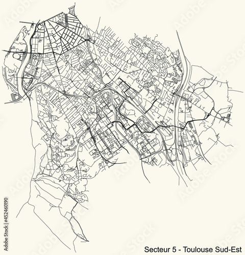 Naklejka premium Black simple detailed street roads map on vintage beige background of the quarter Sector 5 - Toulouse Sud-Est (South East) district of Toulouse, France