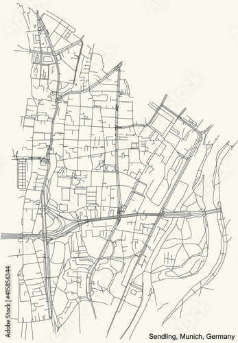 Fototapeta premium Black simple detailed street roads map on vintage beige background of the quarter Sendling borough (Stadtbezirk) of Munich, Germany