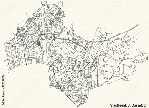 Fototapeta premium Black simple detailed street roads map on vintage beige background of the quarter Stadtbezirk 6 district of Düsseldorf, Germany