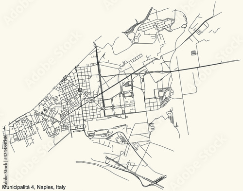 Fototapeta premium Black simple detailed street roads map on vintage beige background of the quarter 4th municipality (Poggioreale, San Lorenzo, Vicaria, Zona Industriale) of Naples, Italy