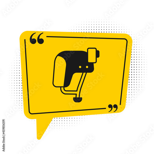 © Kostiantyn, Fototapeta premium Black Skateboard helmet icon isolated on white background. Extreme sport. Sport equipment. Yellow speech bubble symbol. Vector