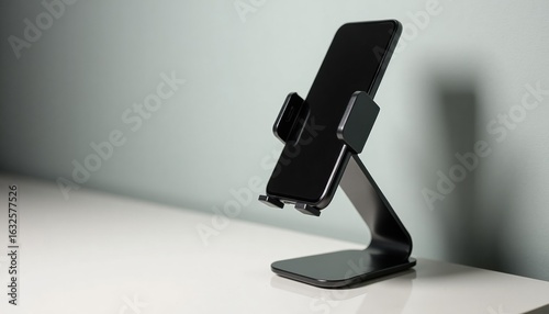 © yuntunen, Naklejka premium Black smartphone on modern stand against minimalist background