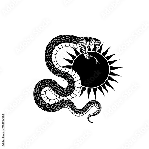 Obraz premium Black Snake Coiling Around Sun Silhouette Symbol of Strength Transformation.